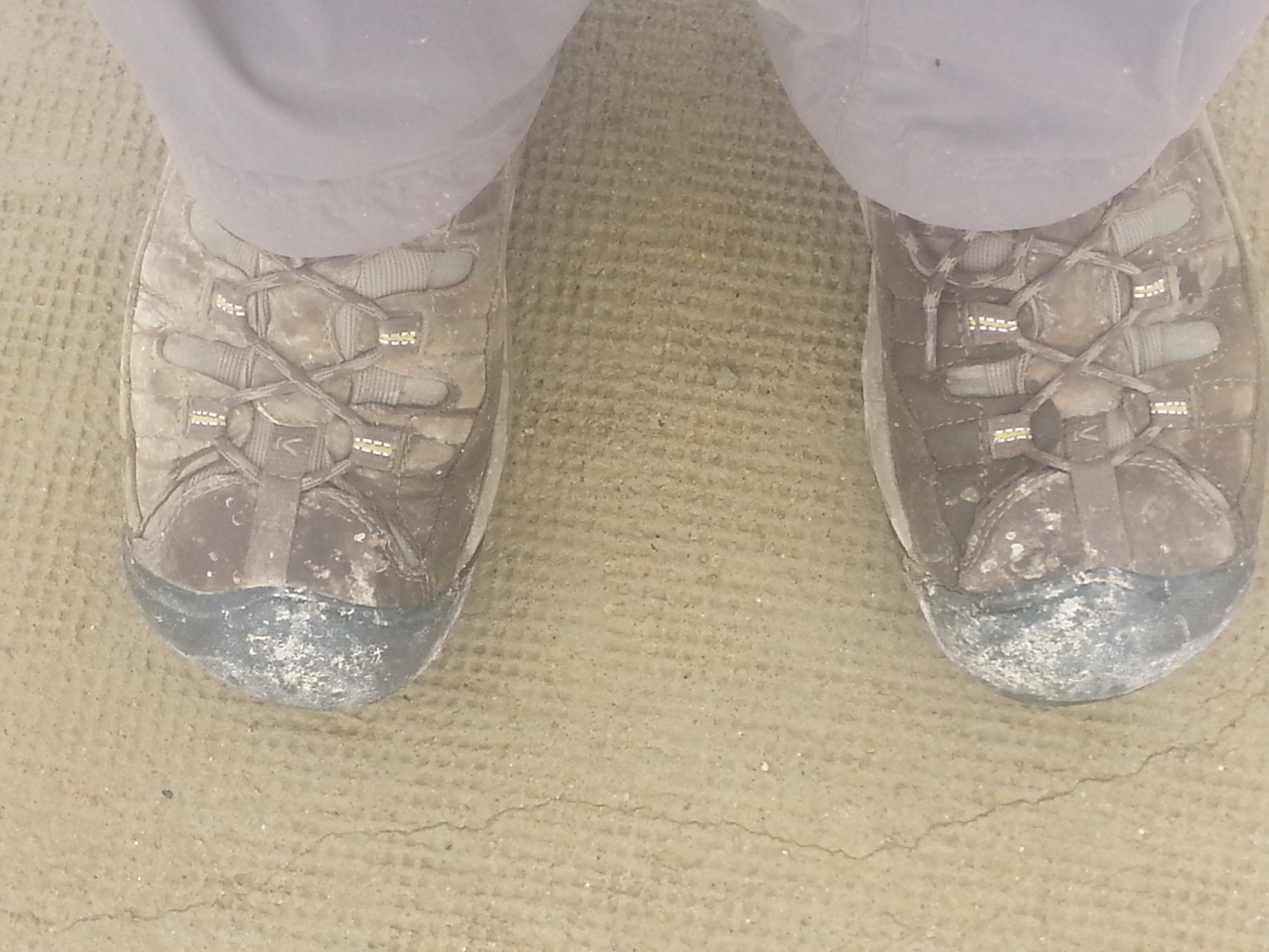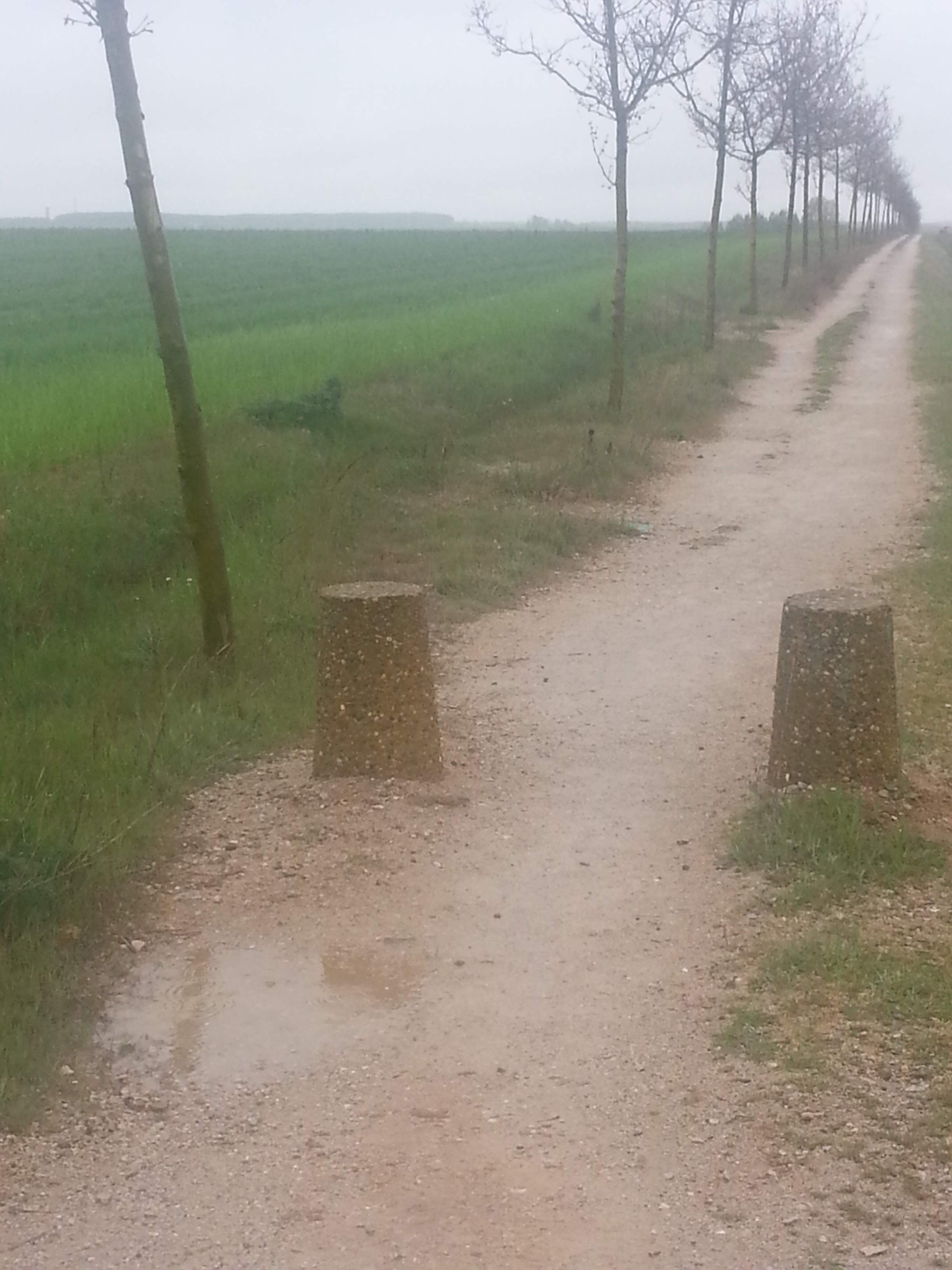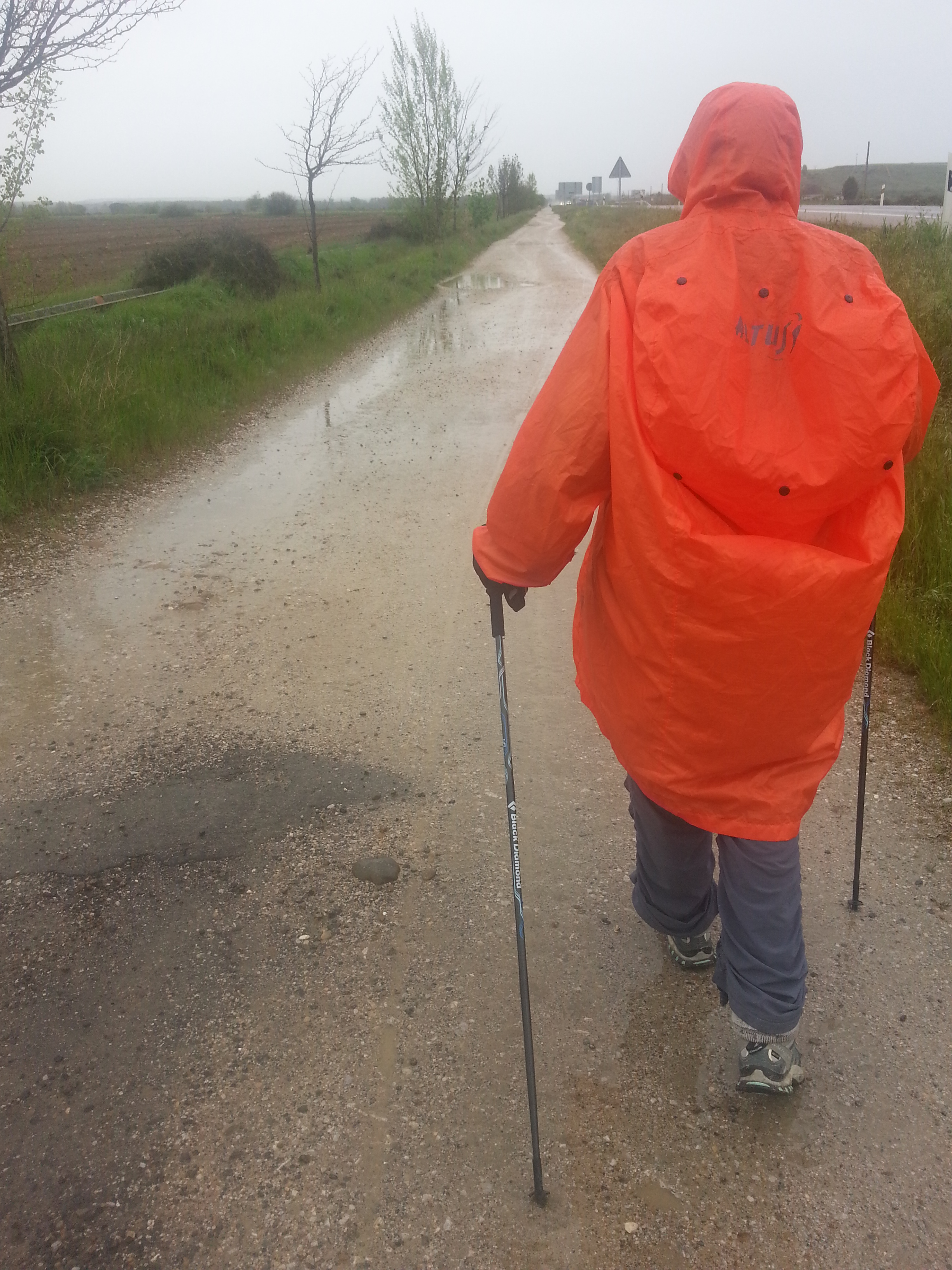 Wednesday,  May 8 This 12 miler was not one of our most memorable. It was20130508_101600 12 miles in a straight line. No large trees, just farmland and wide open land on both sides of the trail. Here is what it looked like.   Notice the puddles. It rained for the first 2 hours.  It was a light steady rain. We wore our 46 Euro dysfunctional ponchos. I didn’t take photos, but visualize this: Angie’s poncho is bright neon orange and mine is bright neon lime……honestly we look like the bumpkins in a Fruit of the Loom ad. I will take photos of these jerky ponchos the next time it rains and then you decide. I want to choke the guy who sold us these bogus rain protectors in St. Jean Pied de Port France. If it wasn’t for the snowing in the Pyrenees,  we would have catapulted these bad boys in a New York minute. You should have seen the looks on the local’s faces when we strolled into town. We didn’t want them to reflect on America or Italy so we started to talk in pig latin whenever we came upon a local. All kidding aside, they did keep us dry……but I ask you….was it worth the price? This is what my boots looked like after 12 miles today:   20130508_141558   Our good friend, Kay Dorrough, asked about what we eat on the Camino. For breakfast we eat very light. It’s called a Pilgrim’s breakfast. Cafe con Leche (coffee with milk) , fresh orange juice and toast. 2 Euro out the door…..That is it. Guess that is enough as we have dinner around 8PM.   Lunch varies. Maybe Bogadillos. These are submarine type sandwiches: Salchison, that is salami; Jamon, that is ham like prochiutto, Choriso well that is…….well you really do not want to know. Just eat it…It’s good and spicy. You might want to stockpile it if you like it. It probably will be banned by Bloomberg soon. You can order any of these sandwiches with queso (cheese).