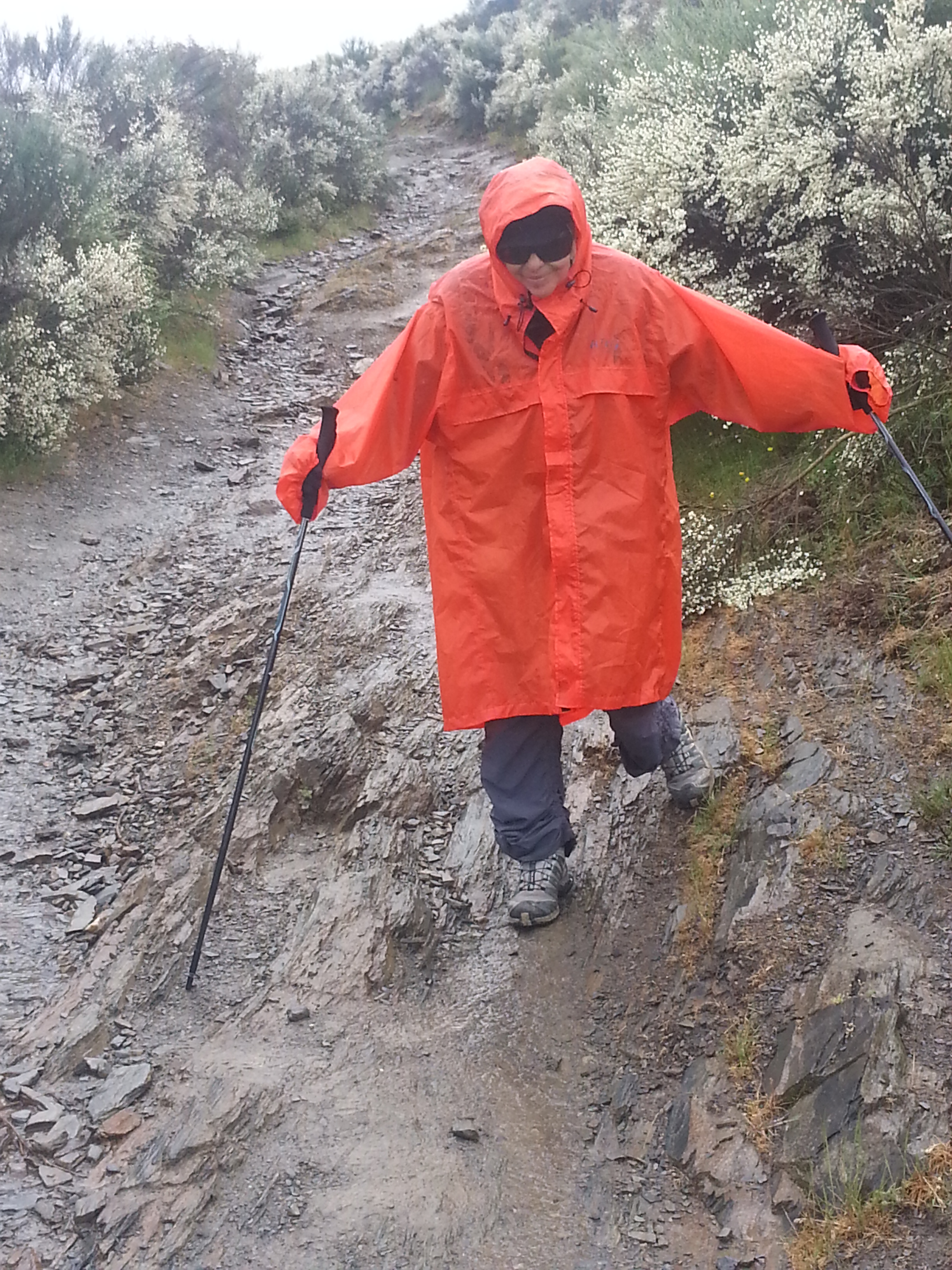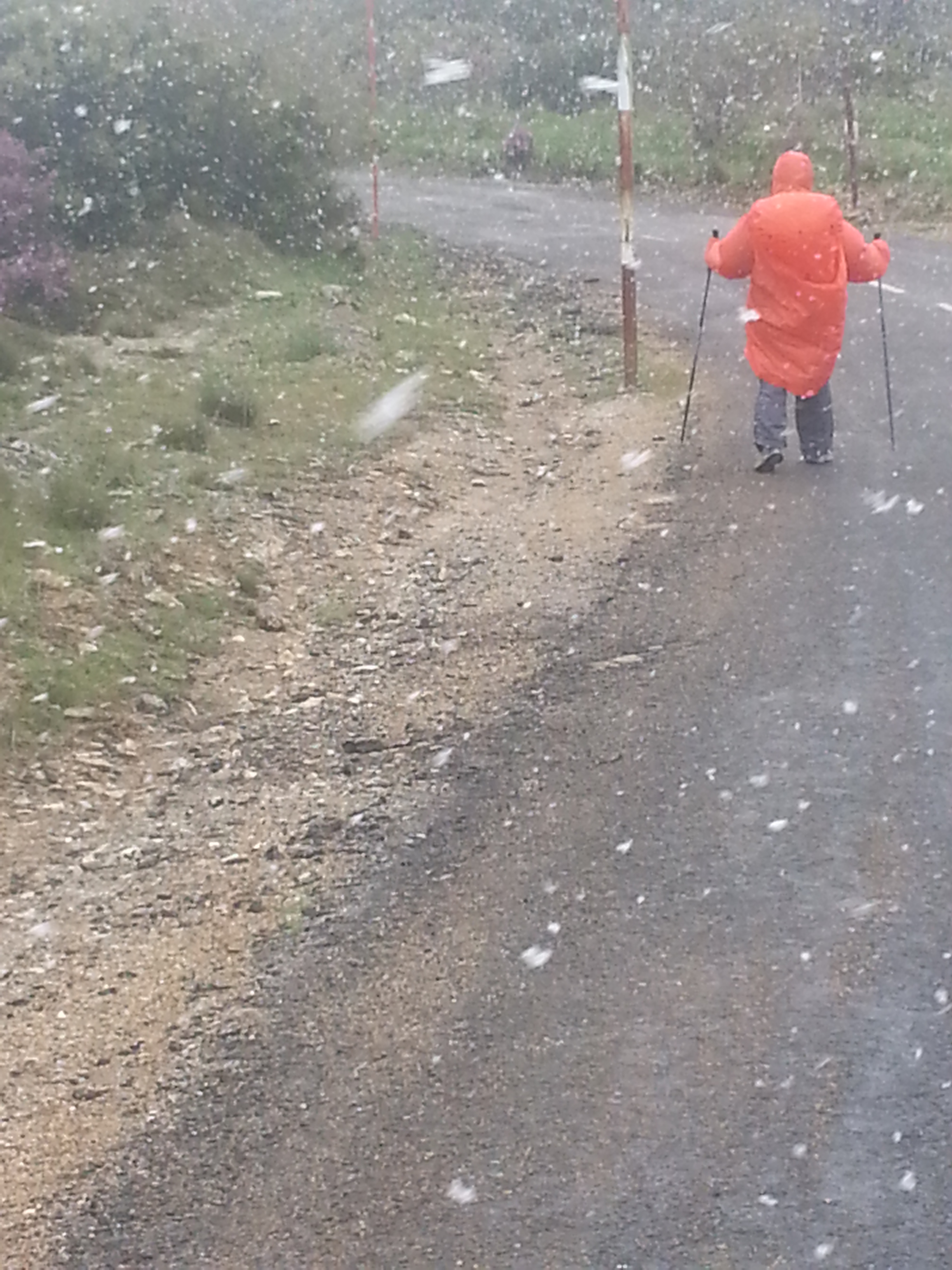 We left for Cruz De Ferro (iron cross) at 8:45 this morning. Temperature was in the high 30s with light snow flurries. It stayed that way all day. We were bundled up including our Fruit of the Loom ponchos!