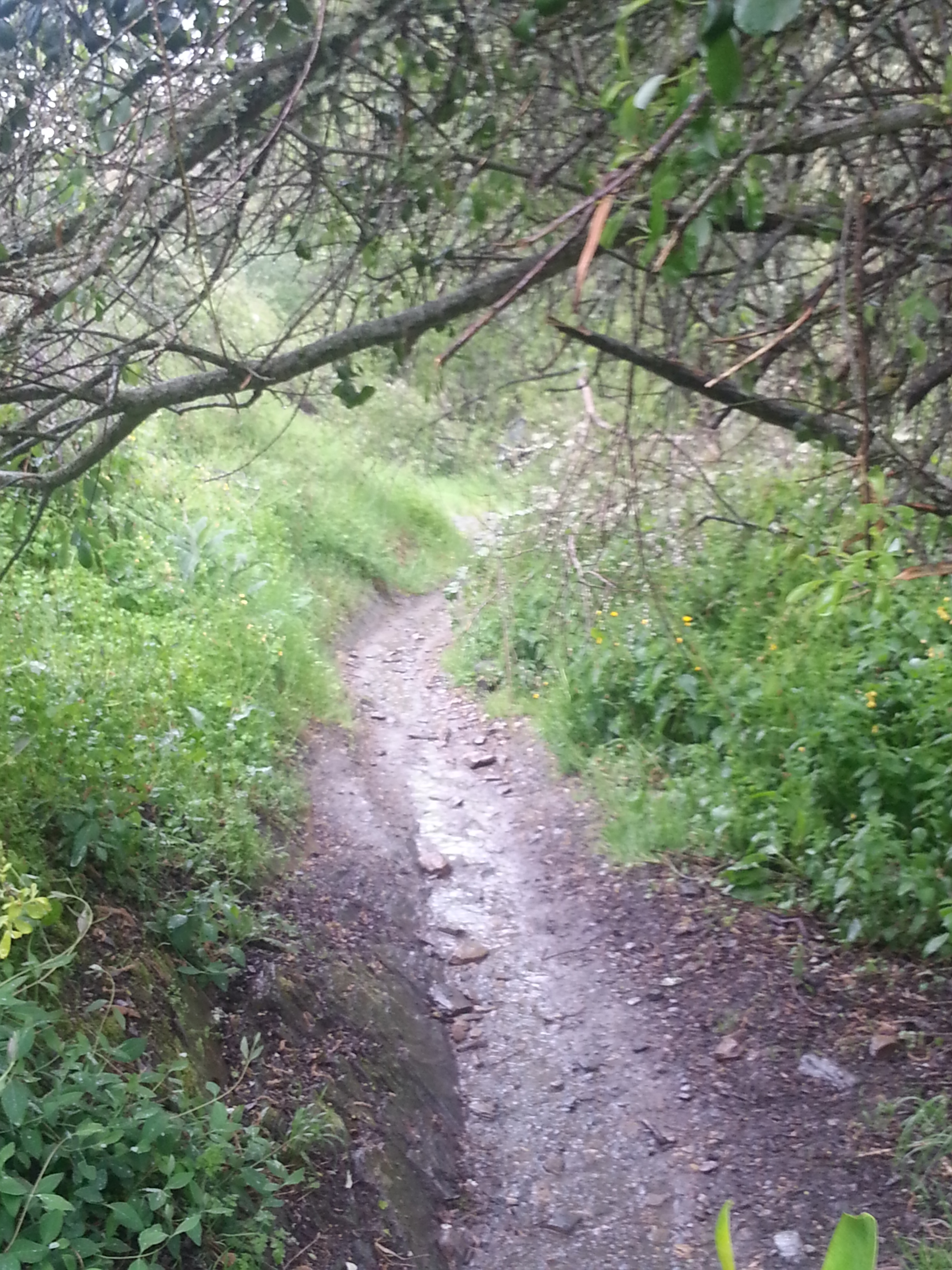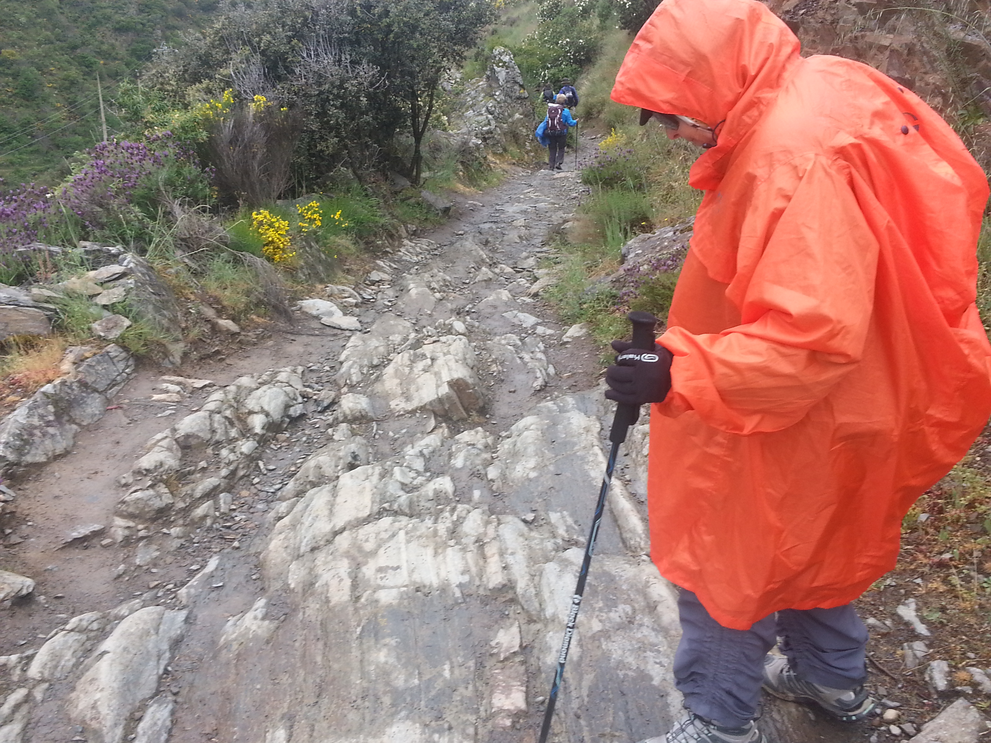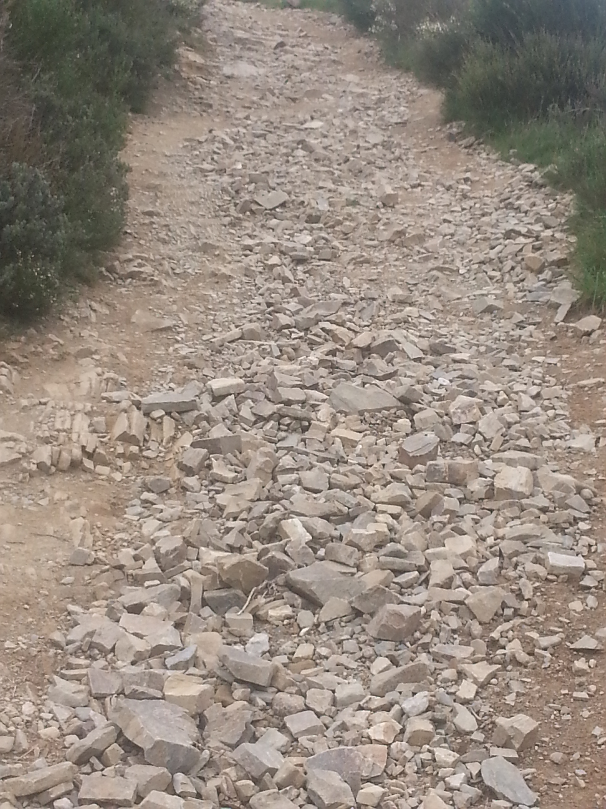 While the uphill leg today presented no problems,  the last 2 miles of the descent was extremely steep, narrow & treacherous. See the photo below. Rocks made passage slow and difficult. Much concentration. If you step on one of these bad boys at the wrong angle you will turn your boots into roller skates for about 2 seconds and then it is “backs” over elbows!